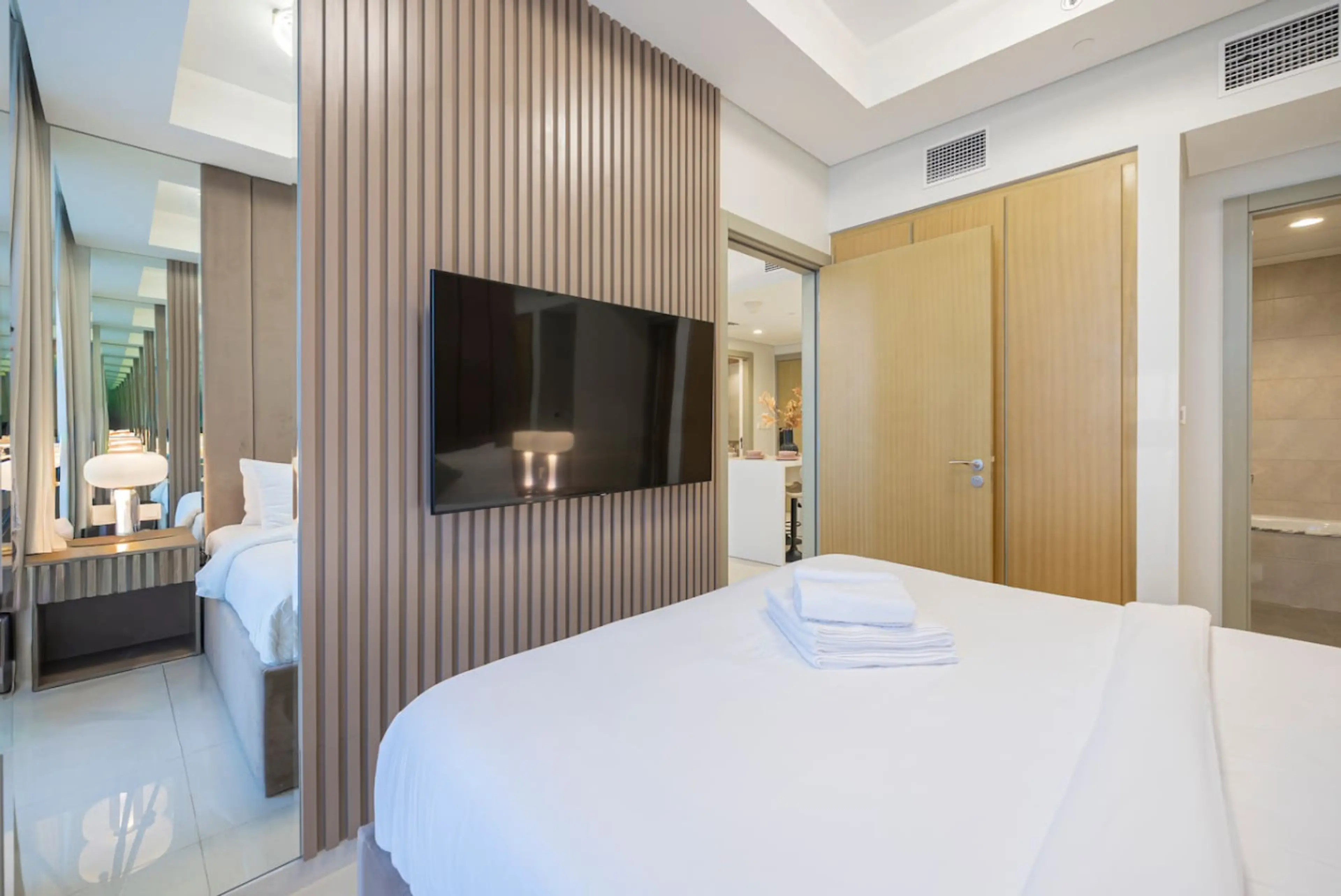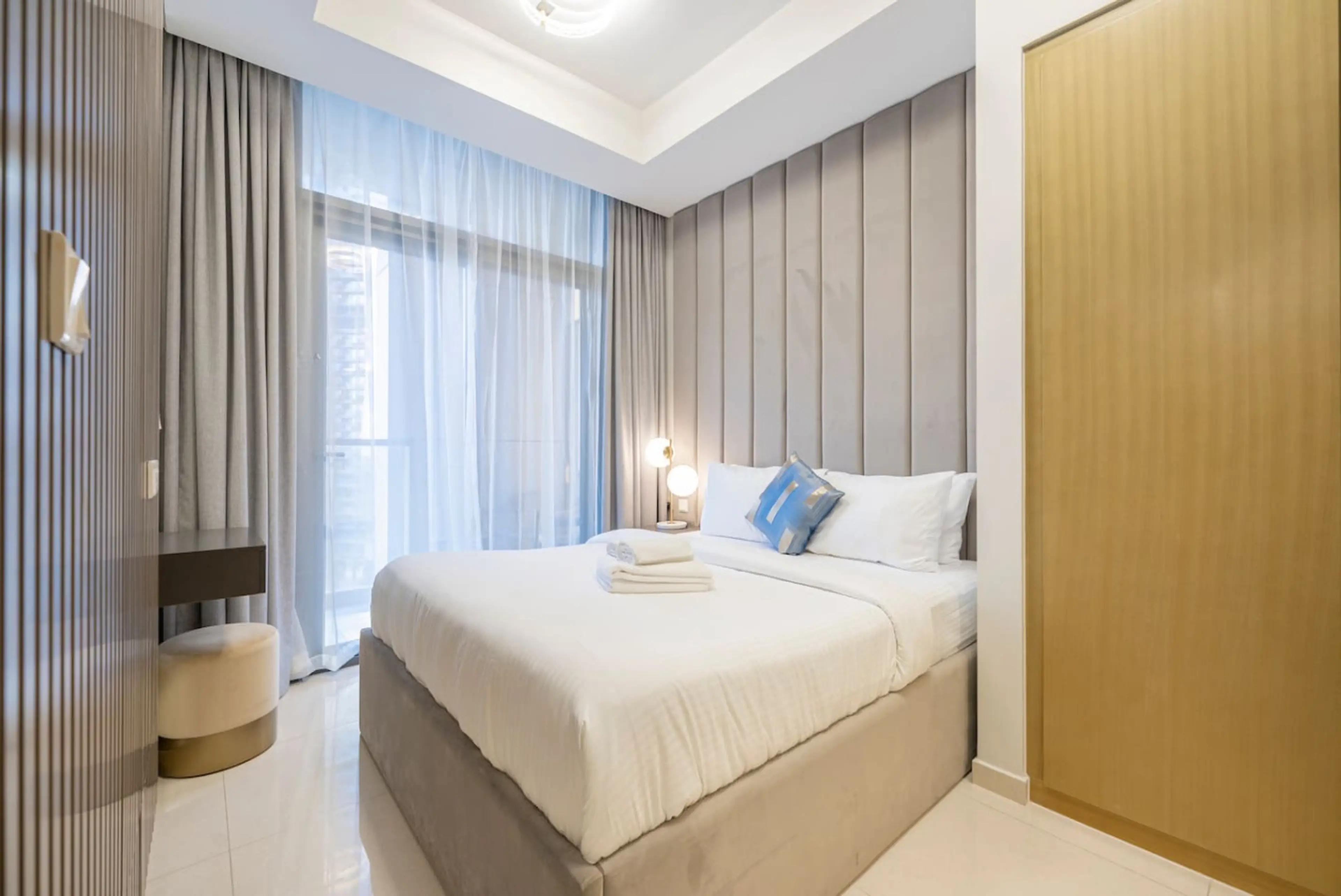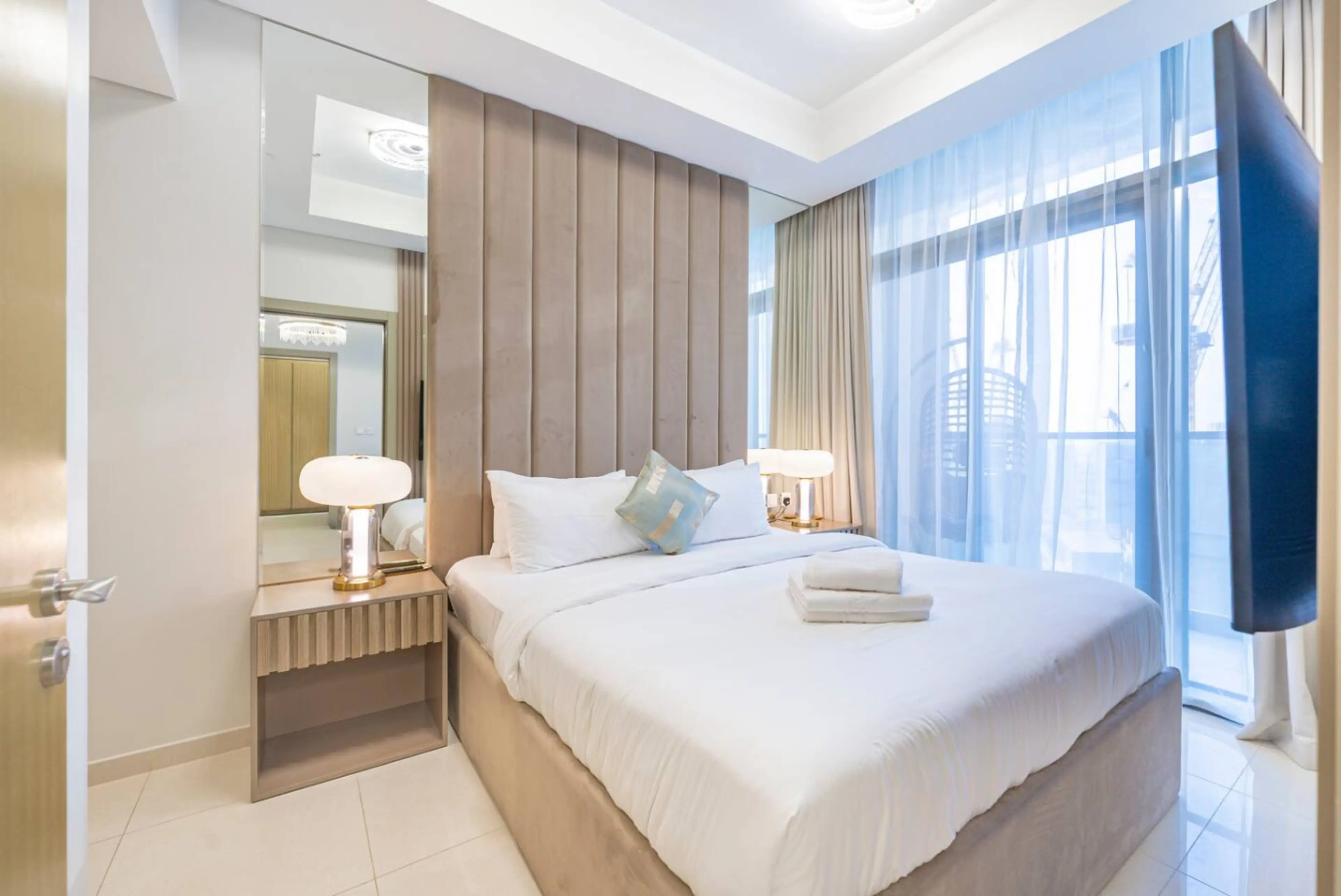 Modern 2-bedroom apartment in Business Bay, close to Burj Khalifa, Dubai Mall, restaurants and cafés. Bright open-plan living/dining area, fully equipped kitchen, Smart TVs, balcony with city views. Master suite (king bed), second bedroom (queen bed). Free parking, high-speed Wi-Fi (250 Mbps), Pool,...