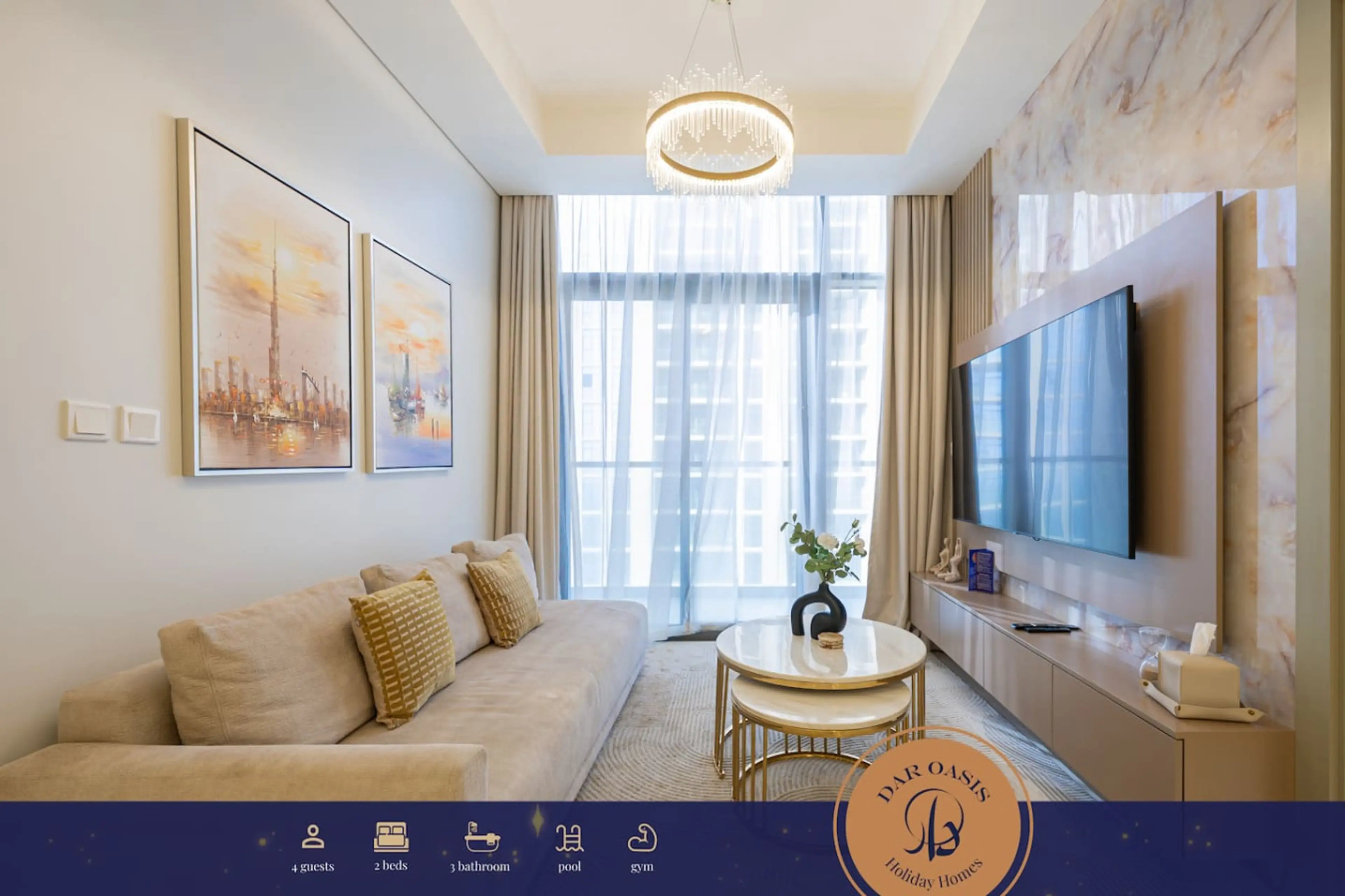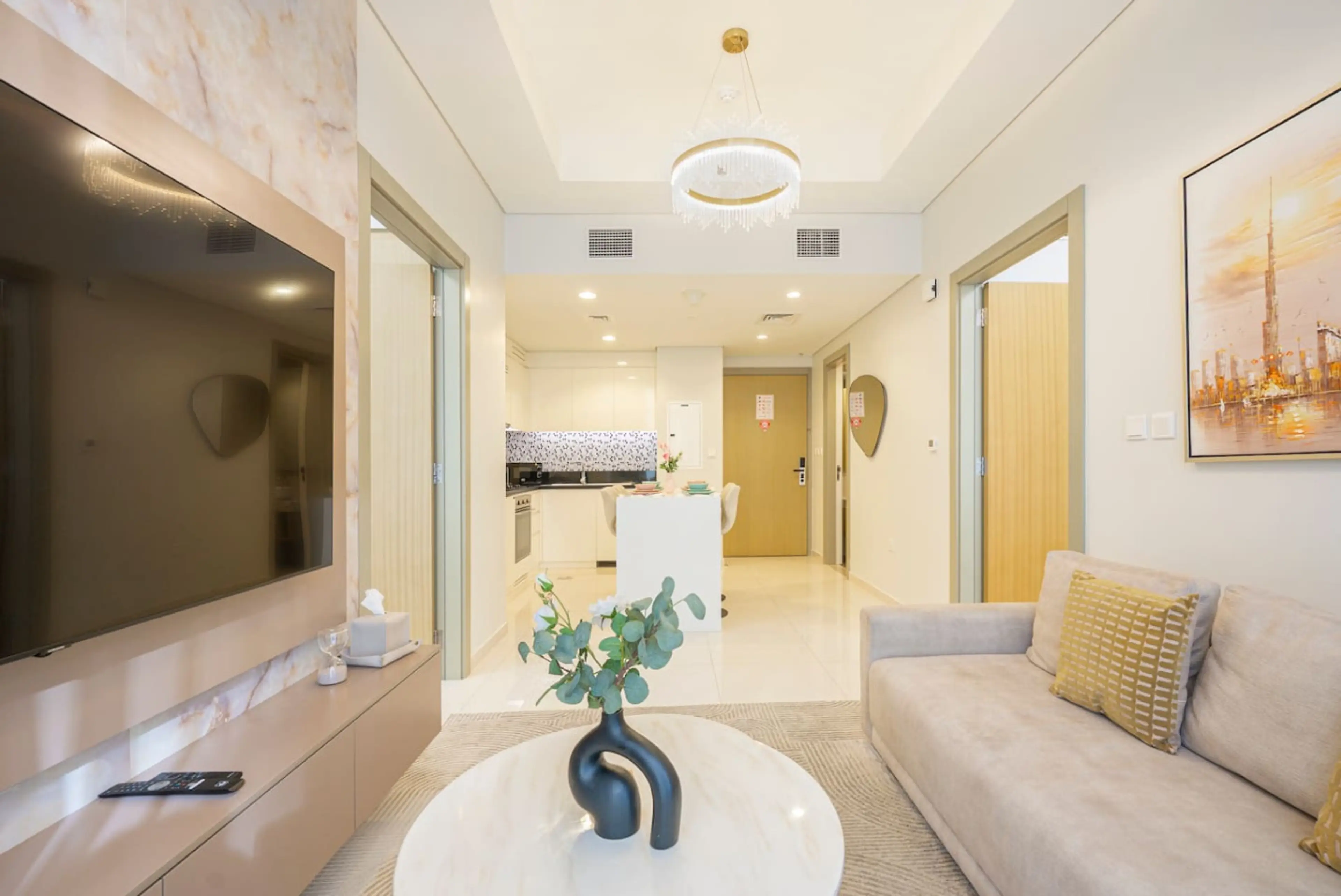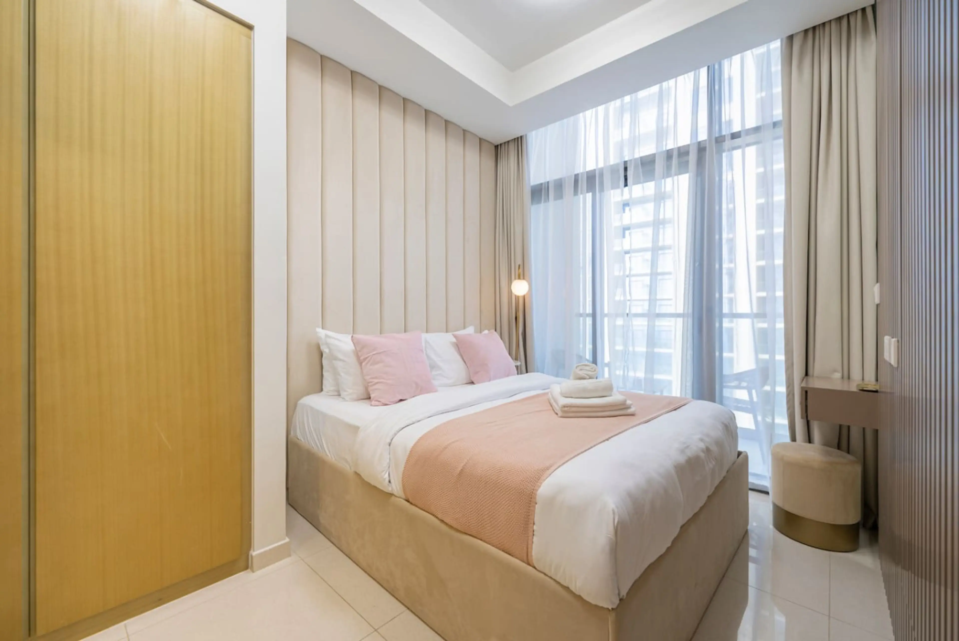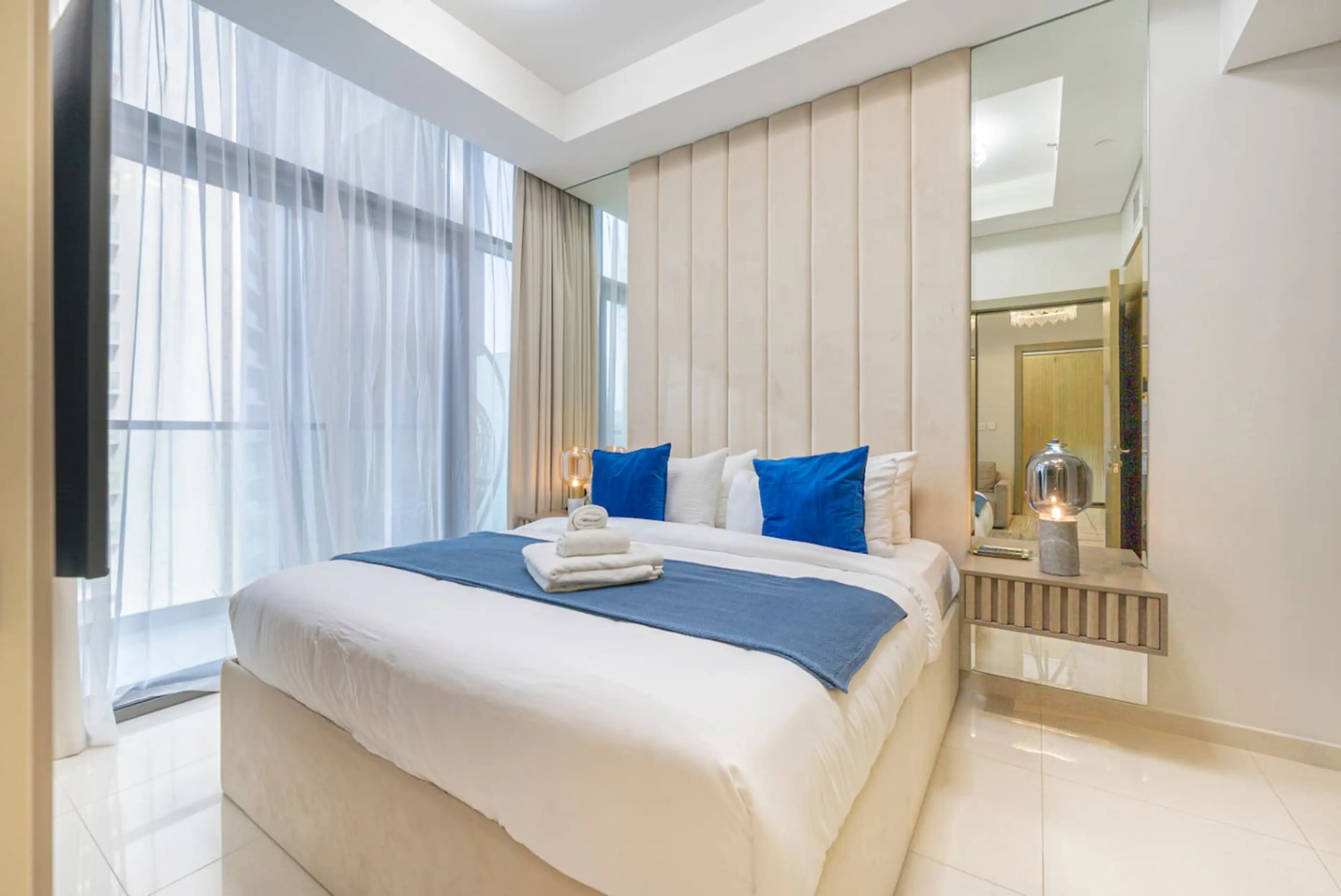 Stylish two bedroom apartment in Business Bay, close to Burj Khalifa, Dubai Mall, restaurants and cafés. Bright open-plan living room, fully equipped kitchen, smart TV, furnished balcony with city views. Master suite (king bed, en-suite bathroom), second bedroom (queen bed). Free parking, high-spe...